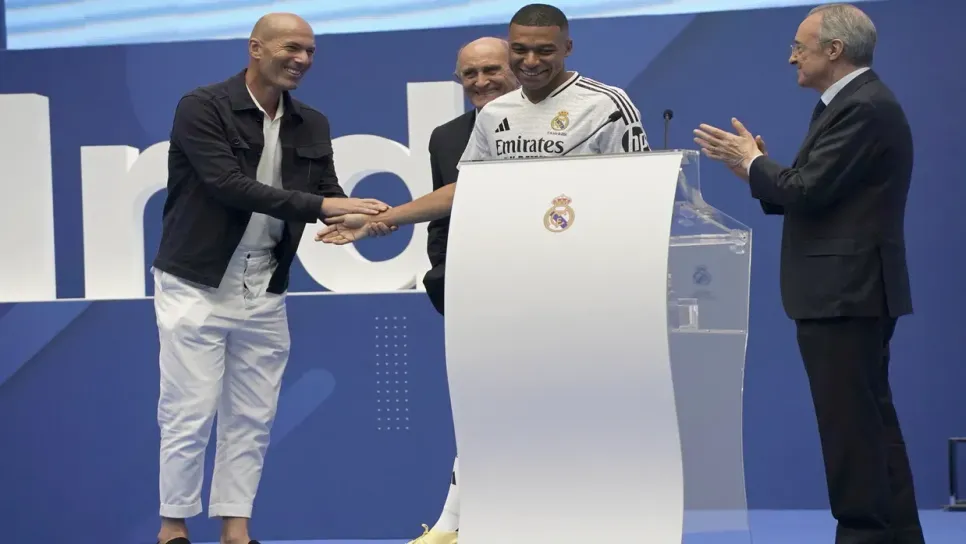 ظهر الفرنسي كيليان مبابي، المنضم حديثا ريال مدريد، لأول مرة بقميص الميرنغي، اليوم الثلاثاء. وأقام ريال مدريد حفلا ضخما لتقديم مبابي بحضور مدرجات.