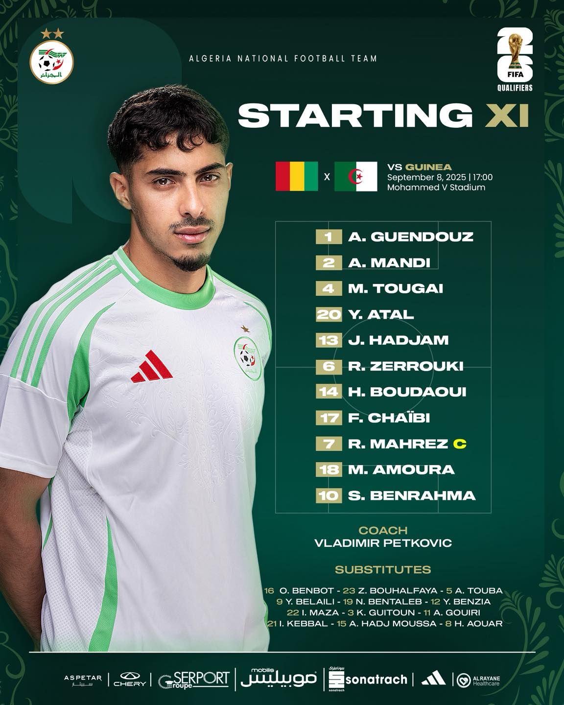 أجرى الناخب الوطني، فلاديمير بيتكوفيتش، تغييرين باقحام حاج موسى وغويري بدلا عن محرز وبن رحمة.
