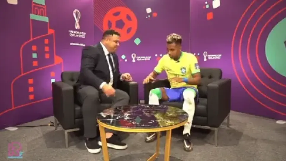 اختار لاعب المنتخب البرازيلي" رودريغو" الذي دخل بديلا في الشوط الثاني من المباراة التي فاز فيها " الصامبا" على سويسرا بهدف دون رّد ضمن منافسات كأس العالم، لقطة طريفة لإنهاء الحوار الذي جمعه بأسطورة كرة القدم رونالدو عقب المباراة التي انتهت بفوز فريقه. وفي نهاية المقابلة صافح رودريغو ملهمه الأول رونالدو بشكل طبيعي قبل أن ينحني ليلمس قدمي الظاهرة ويعود ليلمس قدميه، في لقطة طريفة بدا كأنه يسعى من خلالها للحصول على شيء من السحر الكروي للنجم السابق المتوج بكأس العالم مع منتخب البرازيل في 1994 و2002.