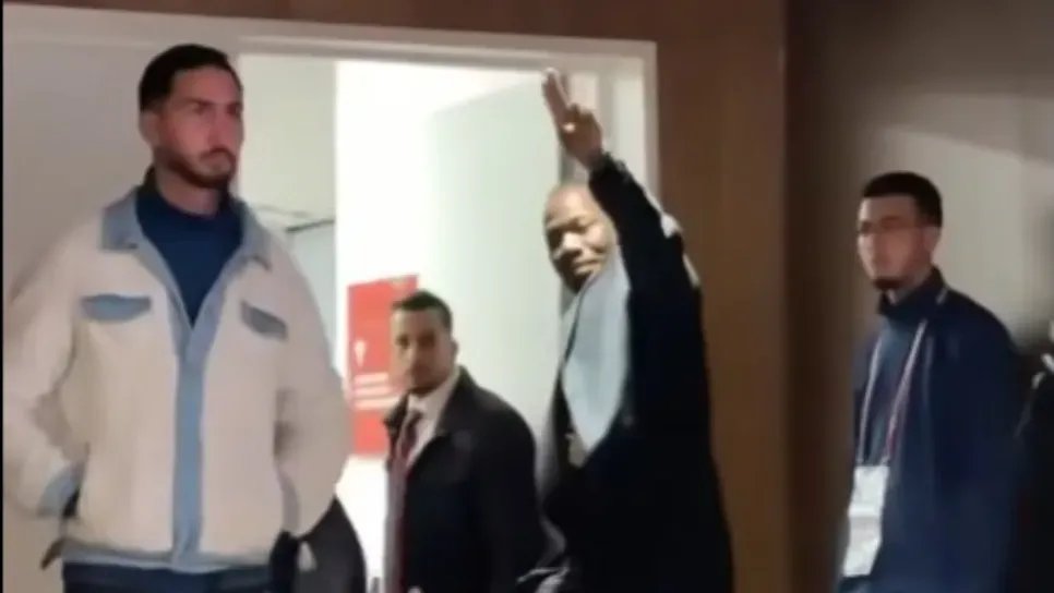 مدرب السنغال وهو يغادر القاعة، رافعا إشارة النصر.
